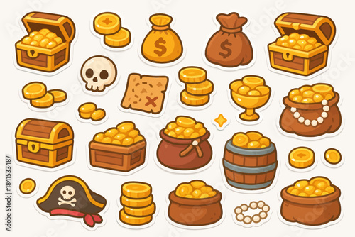 Cartoon treasure icons: chests, coins, bags, and pirate symbols