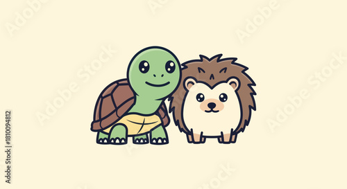 Cartoon turtle and hedgehog together, smiling, on a light yellow background