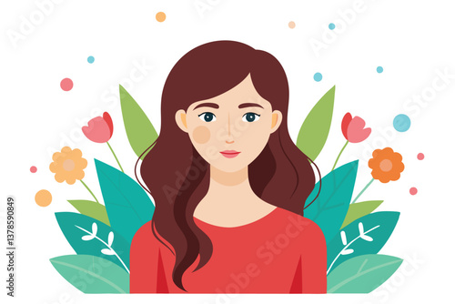 Cartoon Woman Portrait with Flowers and Leaves on a White Background