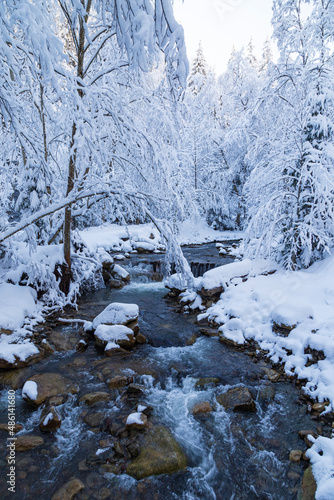 Cascade fast mountain river in the winter snowy forest