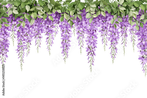 Cascading purple wisteria blooms with green leaves on top, set against a transparent background