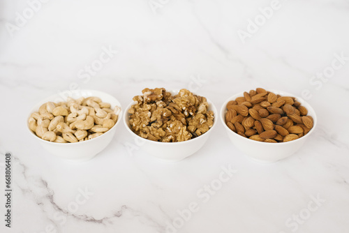 Cashew, walnut and almonds in white cups on a marble table