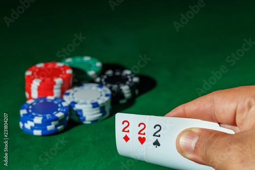 Casino games concept,Poker chips on gamble table , Light through background, winning hands of cards. gambling success