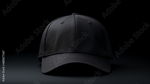 Casquette noire posée sur un fond noir uni. Vue de face. Mode, sport, chapeau. Pour conception et création graphique