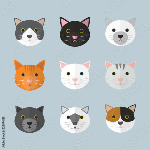Cat faces in many breeds. With plain background. Flat design style.