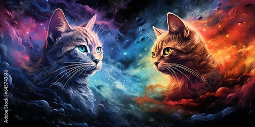 Cats Amidst Ethereal Rainbow: Dreamlike Art Wallpaper with Cosmic Dark Sky and Surreal Atmosphere