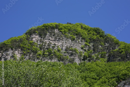 Caucasian mountains in sunny weather, green dense forests on the mountains and snowy peaks of the old high mountains of Georgia