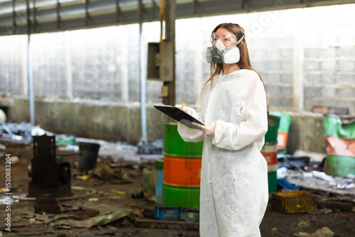 Caucasian woman worker with safety protective face mask in factory. Officials from the Department of Hazardous substances control bureau is investigating the leak of hazardous chemical in industry