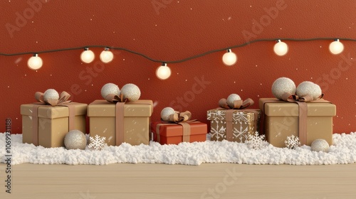 Celebrate the holidays with beautifully wrapped gifts against a festive red background featuring snowflakes