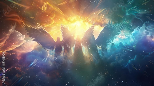 celestial choir scene diverse angelic beings iridescent wings heavenly light beams ethereal atmosphere cosmic background spiritual harmony
