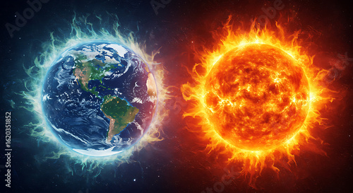 Celestial duality concept with the fiery Sun and the frozen Earth in opposition.