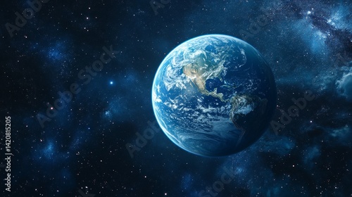 Celestial portrait of Earth suspended in space, radiant blue atmospheric ring, precise geographic details of continents and coastlines, cloud systems over oceans, cosmic darkness with distant stars,