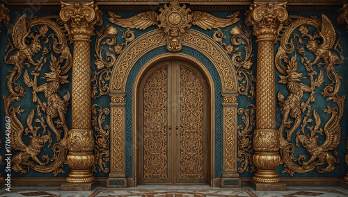 Celtic ethnic art with carved pillars, winged and mythical creatures, and a grand doorway in a palace with gold accents and ornate textures.