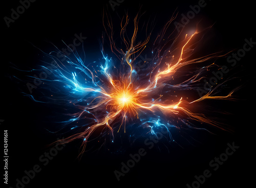 Central vibrant light explodes with dynamic blue and orange trails against a stark black background. Energy radiates outwards in an abstract display.