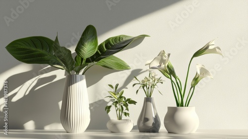 Ceramic vases with indoor plants on white background
