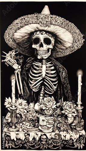 ceremonial altar dedicated to the observance of the Day of the Dead festival, featuring a haunting illustration adorned with marigolds and candles