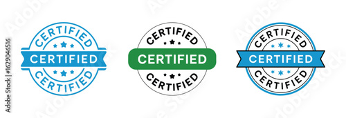 Certified Stamp Vector Set - 3 Icons in Blue, Green, and Black for Official, Verified, and Guaranteed Product or Service Quality.