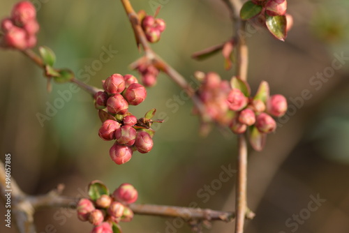 Chaenomeles japonica flower buds on branch, pink spring buds of blooming quince on shrub.