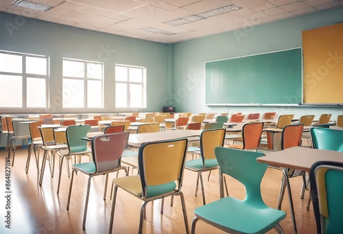 chairs in the class room, open windows and illuminated class room