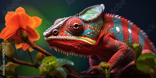 Chameleon on the flower. Beautiful extreme close-up created with Generative Ai