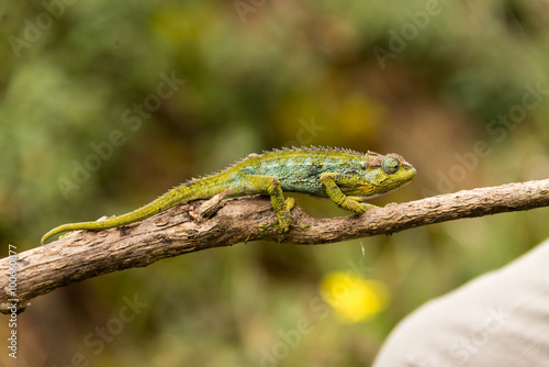 chameleon on twig in ruwenzori mountains, uganda