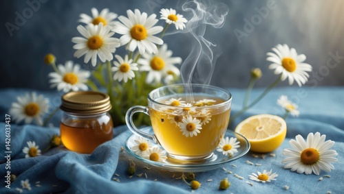 Chamomile tea served in a mug with chamomile flowers in the background during summer