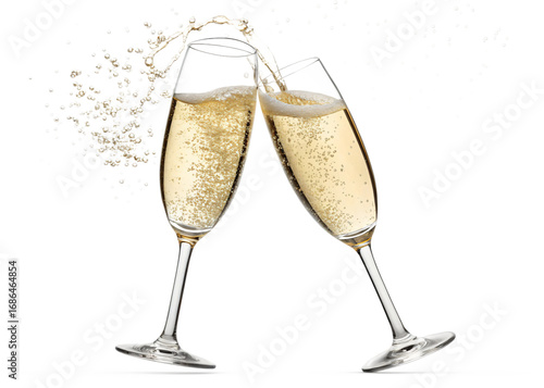 Champagne Toast: A celebration is captured as two elegant champagne flutes touch, sparkling bubbles rise in an effervescent dance, reflecting joy and togetherness.