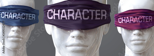 Character can blind our views and limit perspective - pictured as word Character on eyes to symbolize that Character can distort perception of the world, 3d illustration