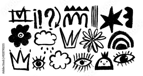 Charcoal graffiti doodle punk and girly shapes collection. Hand drawn grunge style brush strokes, bold curved lines, flowers, crowns, star and others geometric shapes. Vector collage elements.