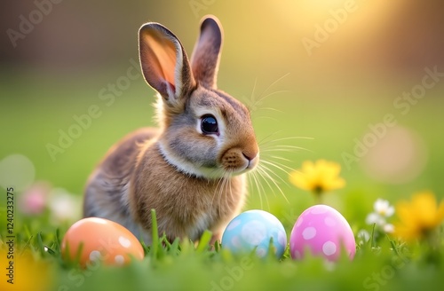 Charming brown rabbit in close-up sitting on green grass, with Easter eggs lying nearby, celebrating Easter