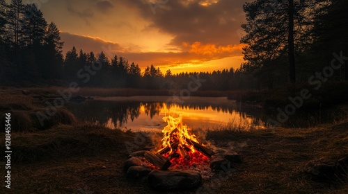 Charming Campfire at Dusk by the Serene Pond