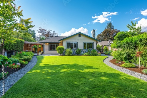 Charming cream-colored house with large backyard, lush green grass, attached garage, and parking area, set against a sunny blue sky in Washington State.