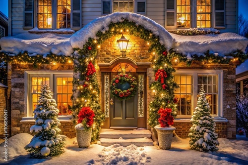 Charming Exterior of a House Adorned with a Light-Up Christmas Archway, Wreaths, Garlands, and Glowing Snowflakes, Capturing the Spirit of Christmas and New Year Celebrations