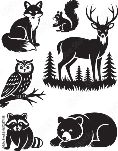 Charming forest animals in black silhouette style