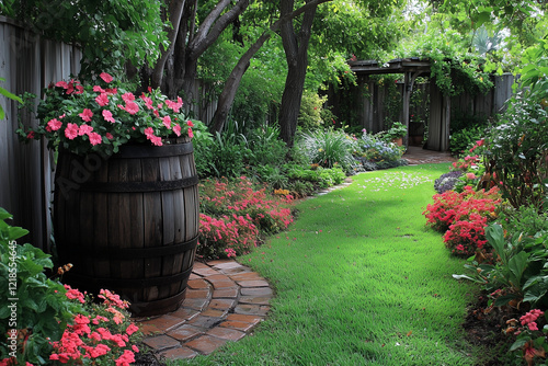 Charming garden path with blooming flowers and wooden barrel surrounded by lush greenery