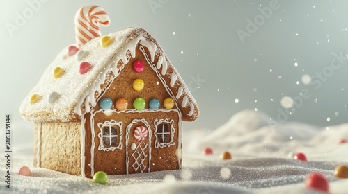 Charming gingerbread house in a snowy winter wonderland. Adorned with candy and icing details. Creating a festive holiday scene. Transport yourself to a world of christmas wonder and sweet memories