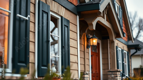 Charming Home Exterior with Dark Shutters and Warm Lighting. Beautiful house architecture, real estate photography
