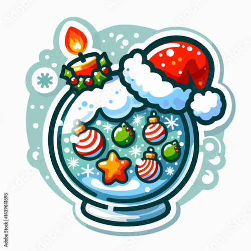 Charming illustration of a snow globe filled with festive holiday ornaments, a candle, and a santa hat. It is perfect for christmas designs.
