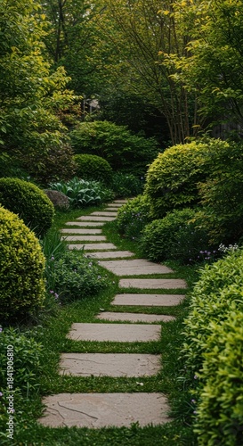 Charming stone walkway meandering through vibrant, flourishing spring foliage and lush green shrubs in a peaceful home garden, ground, foliage, residential