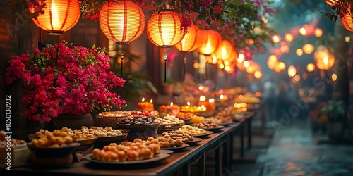 Charming Table Set with Delicious Food and Glowing Lanterns