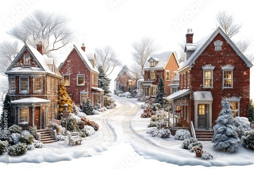 Charming winter houses on snow-covered street, cozy and inviting scene.