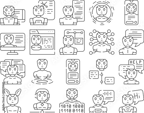 chat bot robot service icons set vector. ai chatbot, mobile digital, support online, technology app, help phone, customer chat bot robot service black contour illustrations