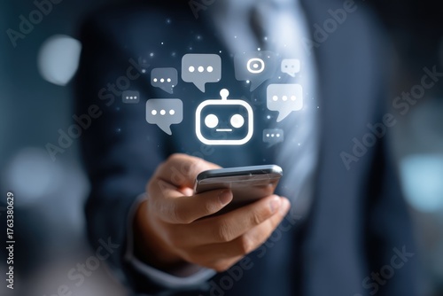 Chatbot Communication and Customer Service on Mobile Phone: Smart Artificial Intelligence and Technology Concept with Robot Icon and Speech Bubbles for Digital Marketing