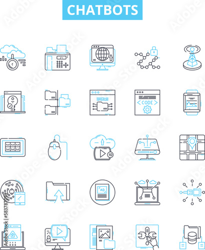 Chatbots vector line icons set. Chatbots, AI, Automation, Dialogue, Conversational, Virtual, NLP illustration outline concept symbols and signs