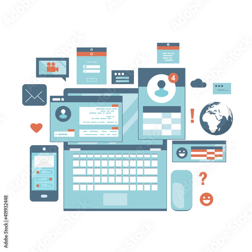 Chatting. Social media network, online internet communication. Website page social Interface. Mobile and computer user screens, home page.