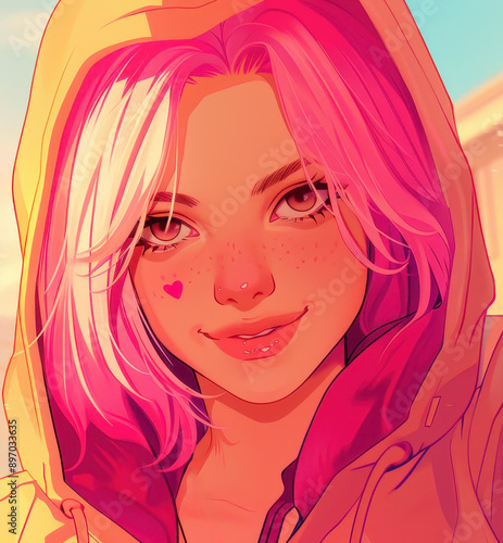 Cheerful anime girl poses in the street, sporting a windbreaker and flashing a peace sign, exuding happiness in vibrant colors.