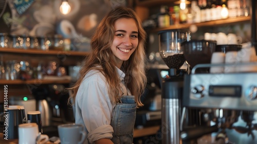 Cheerful barista girl making coffee with coffee machine at cafe counter. Small business owner concept.