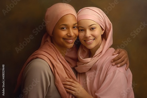 Cheerful cancer survivor girl embracing a friend, pink and amber tones. Generative AI
