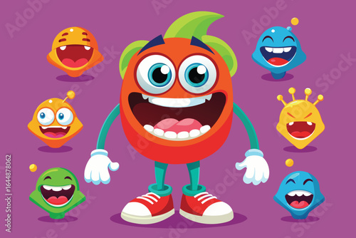 Cheerful cartoon monster characters with various expressions on a vibrant purple background for creative design