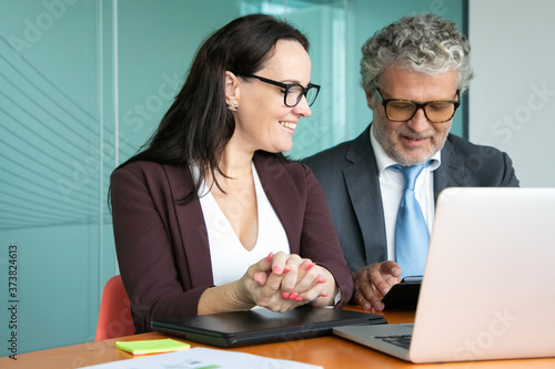 Cheerful colleagues or business partners meeting and discussing project, sitting at open laptop, using tablet, talking and smiling. Medium shot. Business communication concept